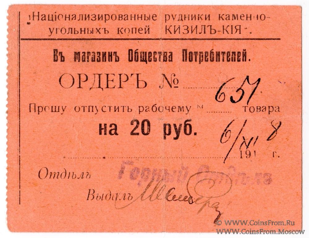 Ордер. Без номера. Бумага цветная (оранжевая). Штамп "Горный Отдъл" (горный отдел). Национализированные рудники каменно-угольных копей "Кизил-Кия".