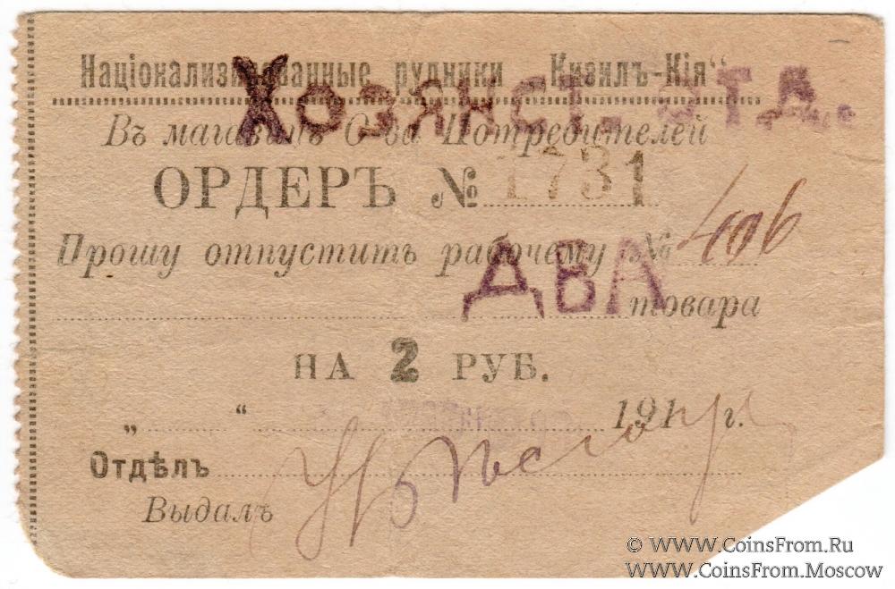 Ордер с надпечаткой номинала. Бумага серая. Штамп "Хозяйст. отд." (хозяйственный отдел). Национализированные рудники "Кизил-Кия".