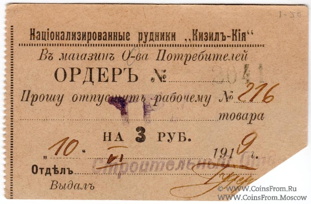 Ордер с надпечаткой номинала. Бумага серая. Штамп "Строительный Отдъл" (строительный отдел). Национализированные рудники "Кизил-Кия".