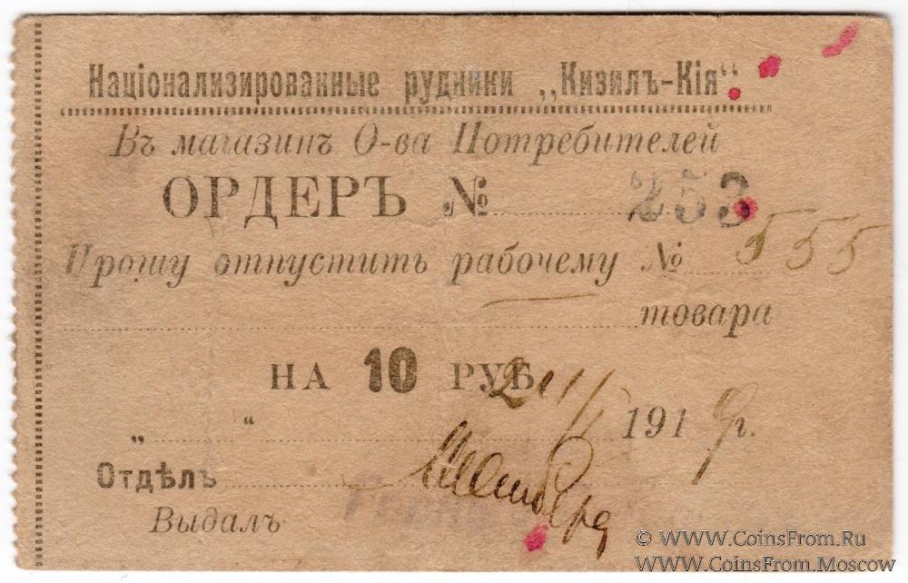Ордер. Бумага серая. Штамп "Горный Отдъл" (горный отдел). Национализированные рудники "Кизил-Кия".