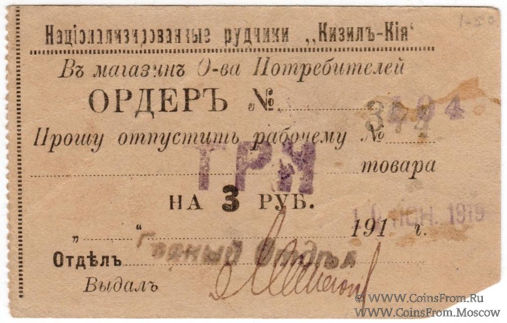 Ордер с надпечаткой номинала. Бумага серая. Штамп "Горный Отдъл" (горный отдел). Национализированные рудники "Кизил-Кия".