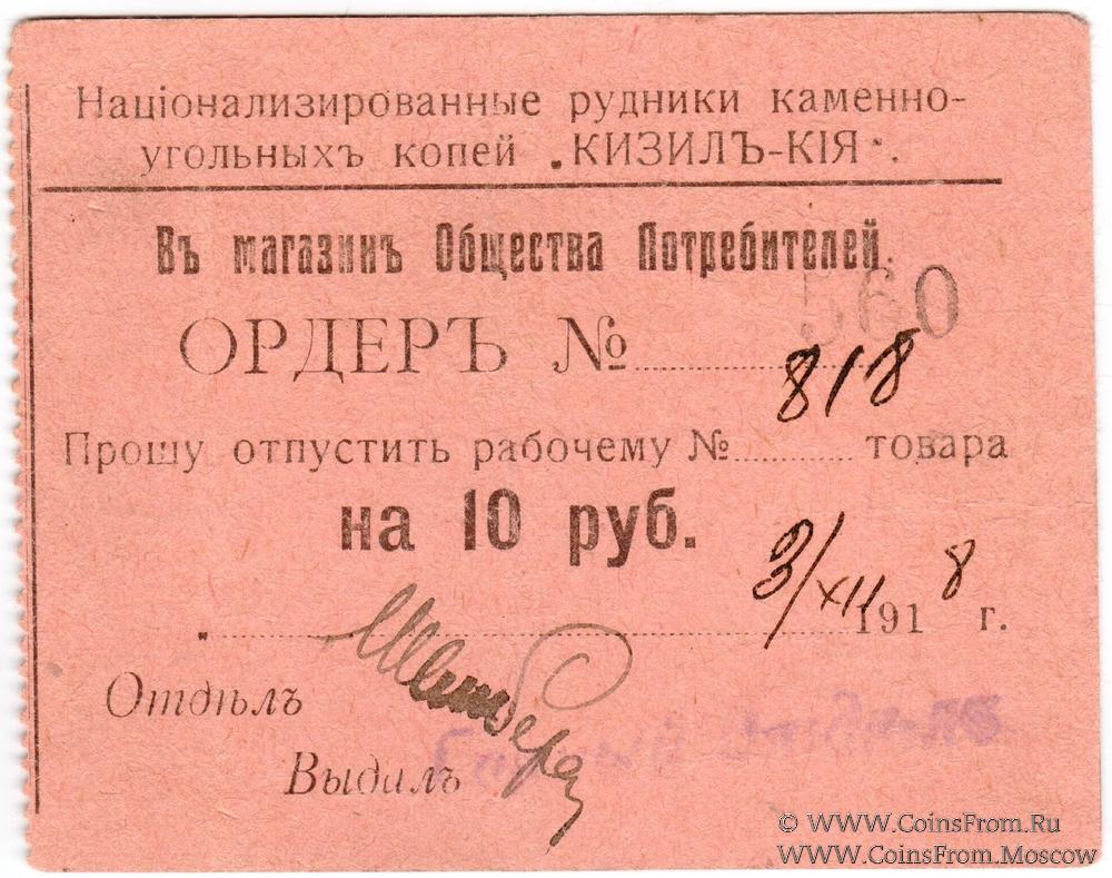 Ордер. Бумага цветная (розовая). Штамп "Горный Отдъл" (горный отдел). Национализированные рудники каменно-угольных копей "Кизил-Кия".
