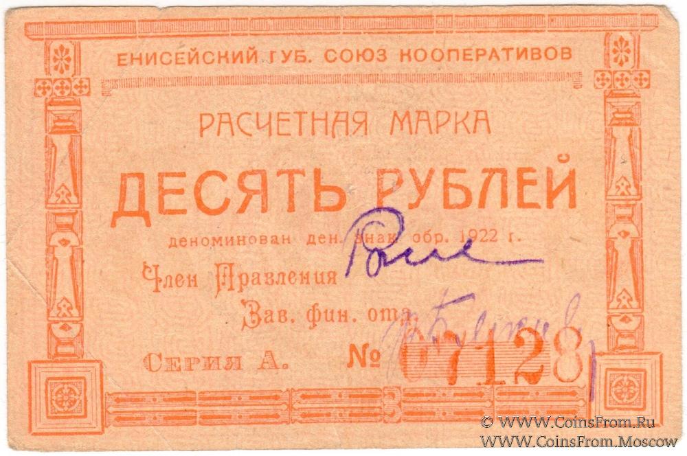 Расчетная марка. Вариант рамки на реверсе. Шрифт номинала жирный, прямой. Отделение в Ачинске Енисейского Губернского Союза Кооперативов (Красноярск).