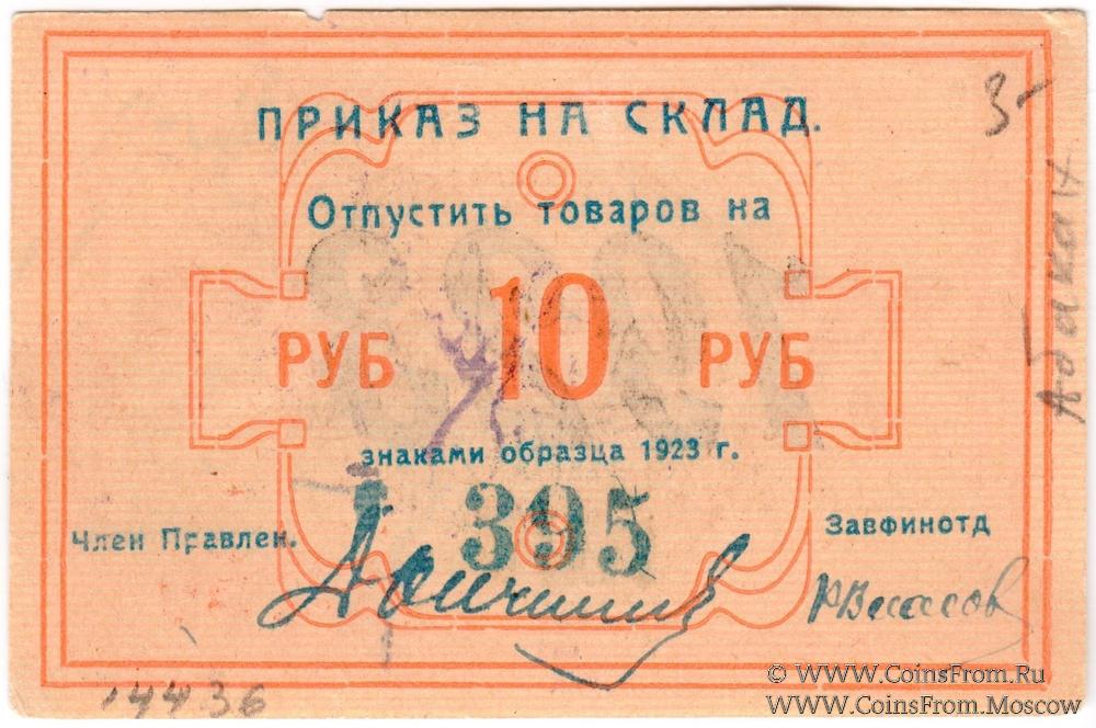 Приказ на склад c чёрной надпечаткой (1923 года на аверсе и синего текста на реверсе) на расчетных марках Енисейского Губсоюза кооперативов (Красноярск).