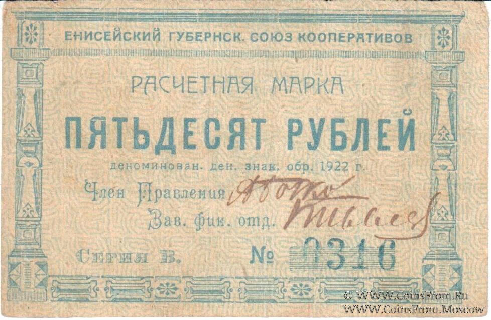 Расчетная марка без даты (1922 г.). Без печати. Шрифт номинала жирный, прямой. Вариант 3 рамки. Енисейский Губернский Союз Кооперативов.