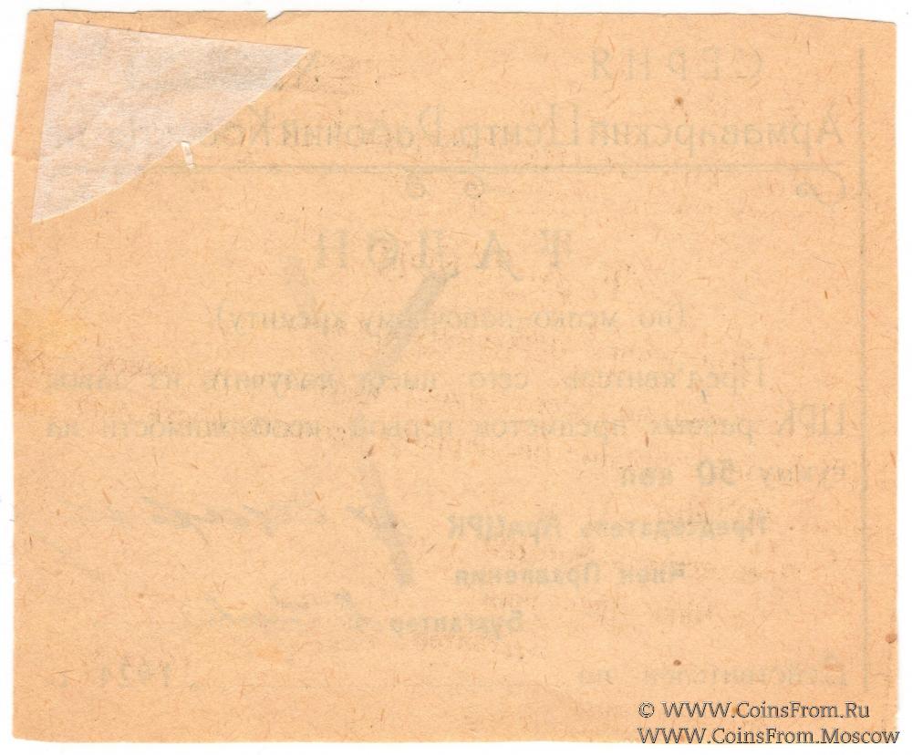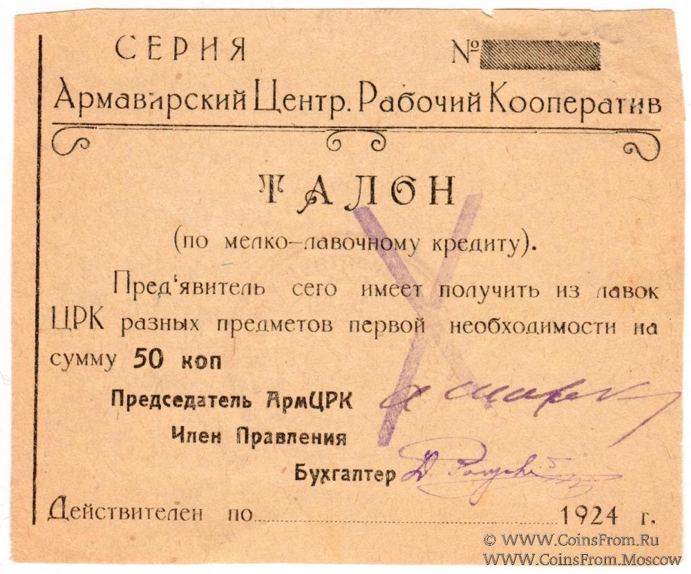 Талон. Бланк с оттиском печати ЦРК, подписями ответственных лиц и крестообразным гашением. Армавирский Центральный Рабочий Кооператив.