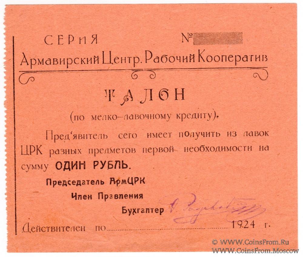 Талон. Бланк. Подпись бухгалтера. Армавирский Центральный Рабочий Кооператив.