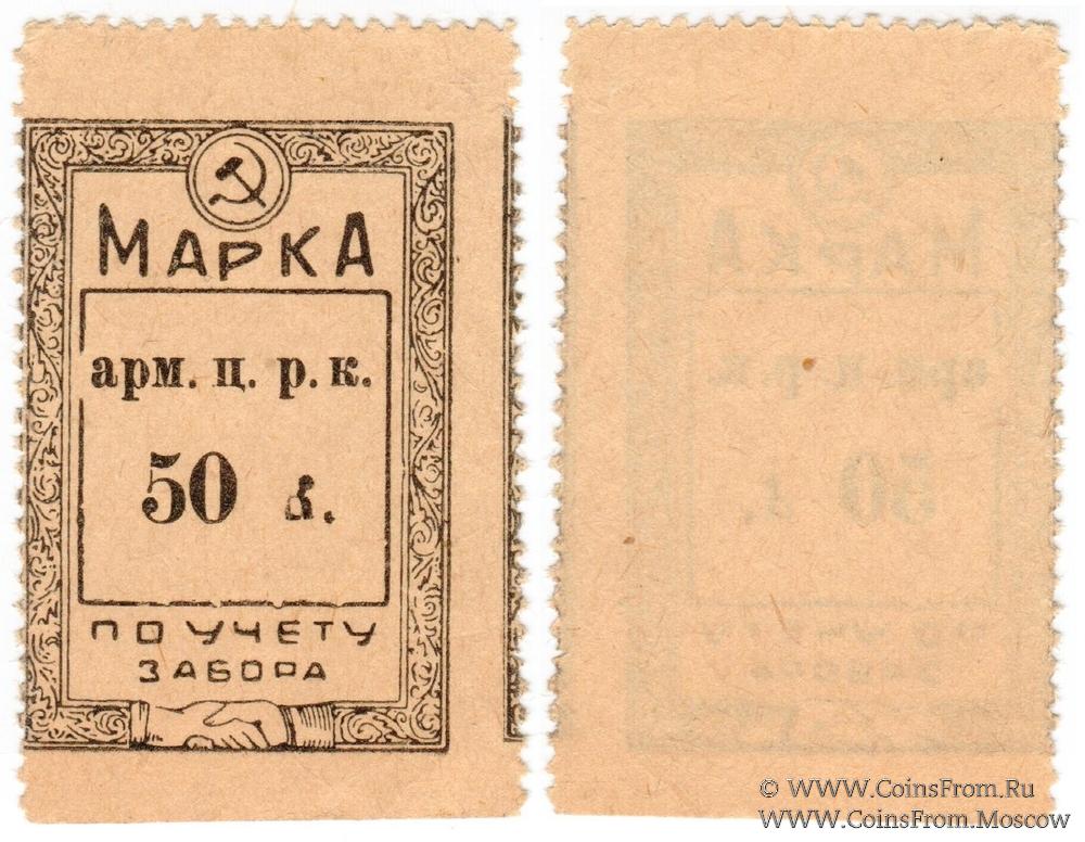 Марка без даты. БРАК печати: непропечатка буквы "К.", сдвиг рисунка. Зубцы с трех сторон. Арм. Ц.Р.К. (Армавирский Центральный Рабочий Кооператив).