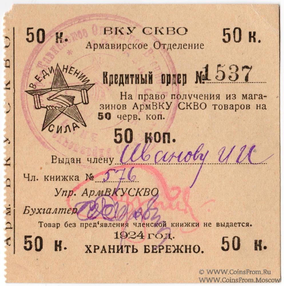 Кредитный ордер. Отделение ВКУ СКВО (Военно-Кооперативное управление Северо-Кавказского Военного Округа).
