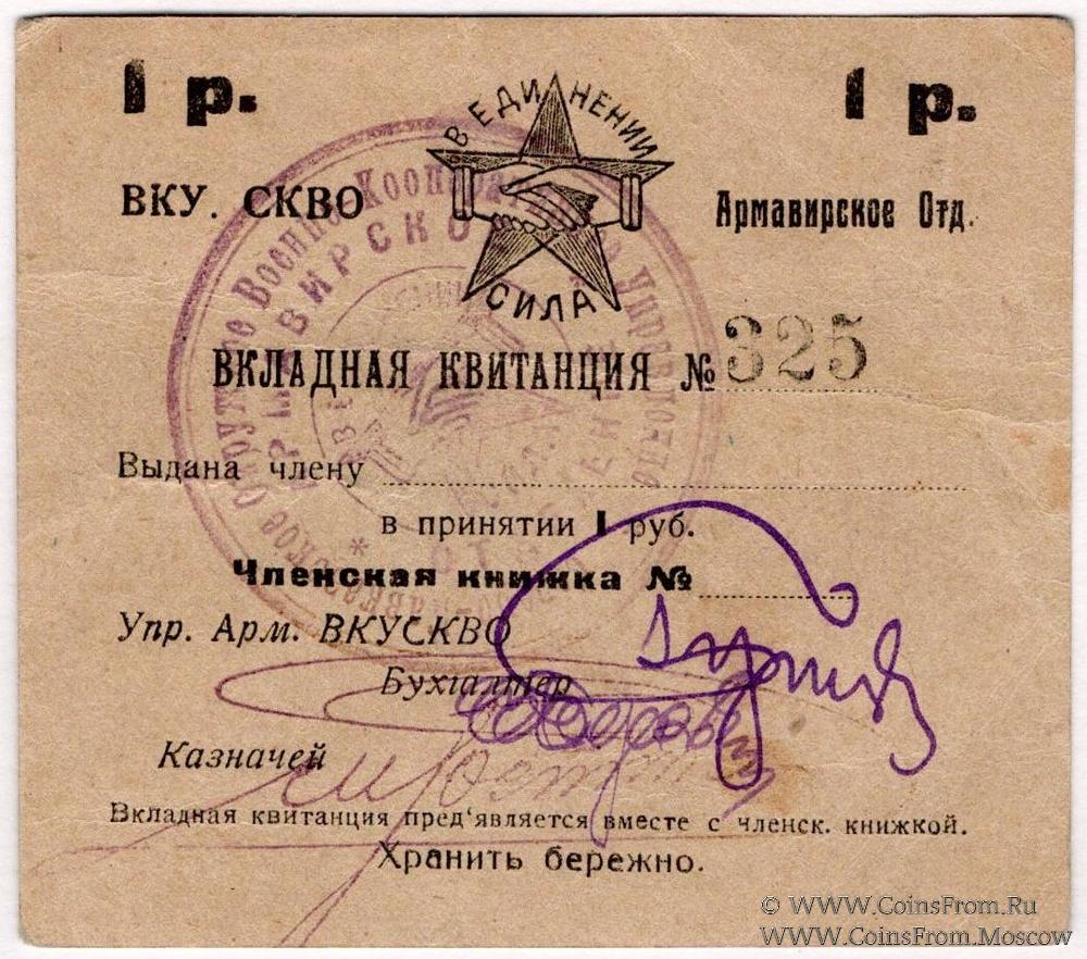 Вкладная квитанция. Отделение ВКУ СКВО (Военно-Кооперативное управление Северо-Кавказского Военного Округа).