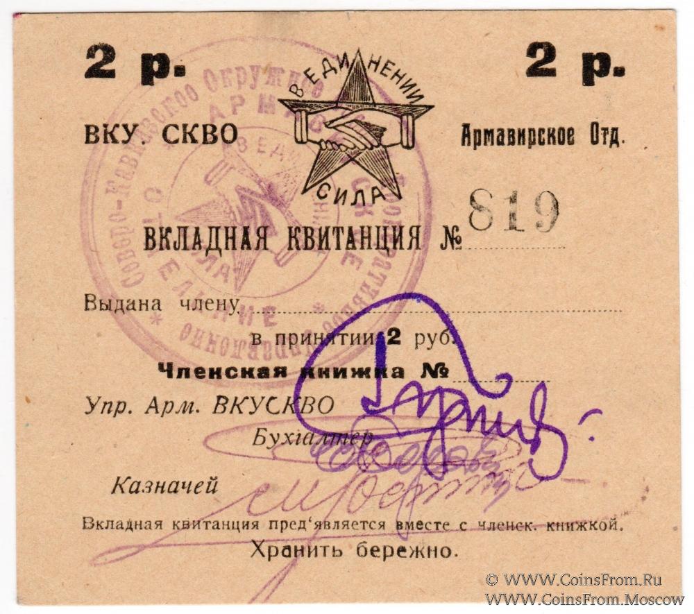 Печать круглая: "Северо-Кавказское Окружное Военно-Кооперативное Управление * " (по большому кругу) / " * АРМАВИРСКОЕ ОТДЕЛЕНИЕ * " (по малому кругу) / Рукопожатие на фоне звезды и надпись "В ЕДИНЕНИИ СИЛА" (по центру).
