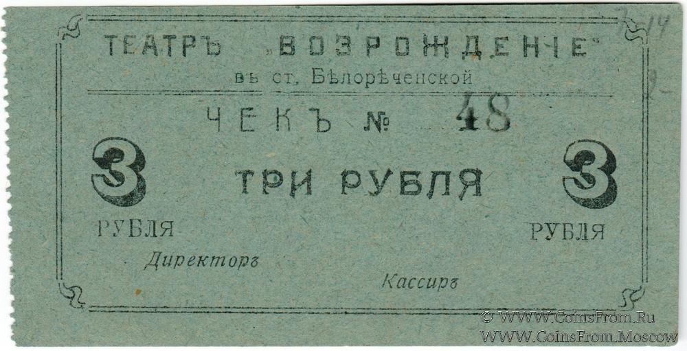 Чек (1919 г.) без даты. Театр "Возрождение" в станице Белореченской.