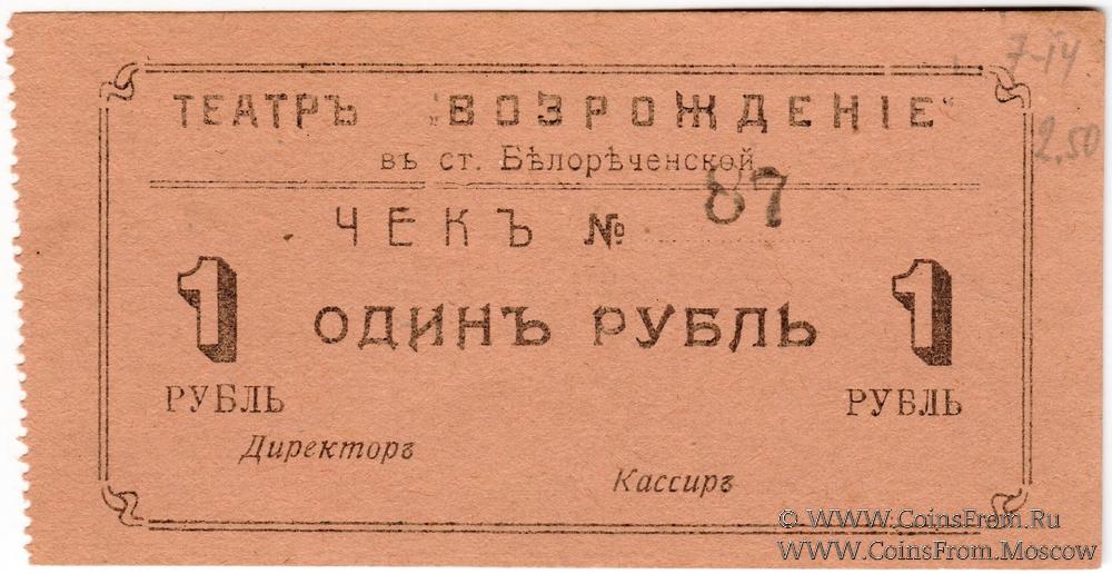 Чек (1919 г.) без даты. Театр "Возрождение" в станице Белореченской.