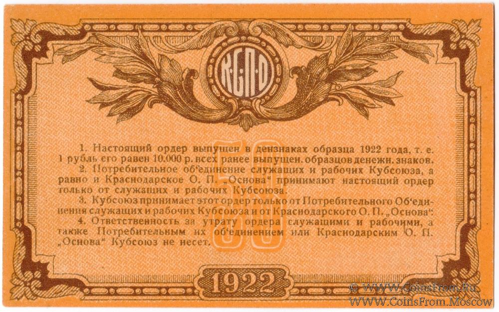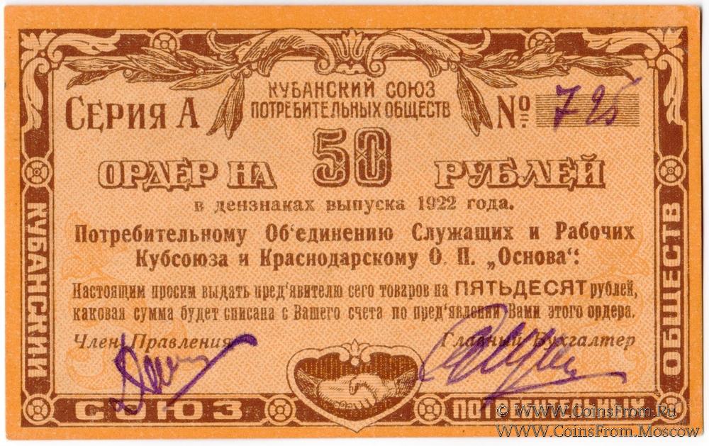 Ордер. Серия А. С подписями, номер от руки. Потребительскому Объединению Служащих и Рабочих Кубсоюза и Краснодарскому О.П. "Основа". Кубанский Союз Потребительских Обществ (КСПО). Кубсоюз.