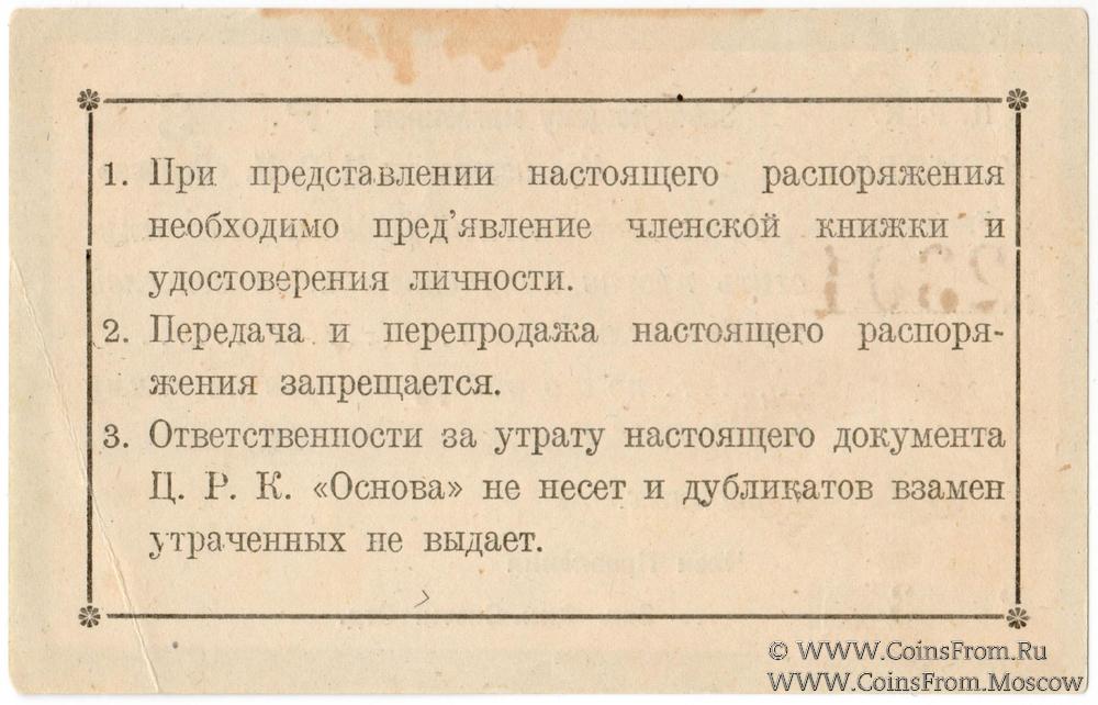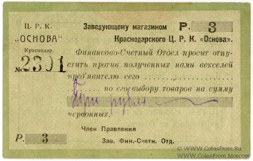Бланк без даты (1923 г.). Надпись номинала от руки. Номер 4-значный. Краснодарский Ц.Р.К. "Основа".