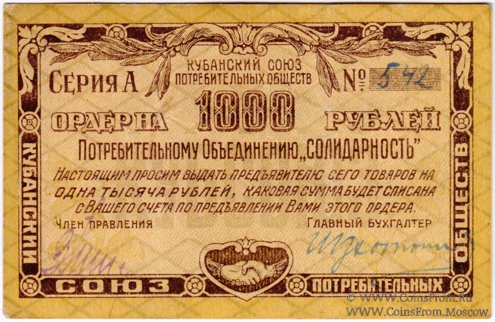 Ордер. Серия А. Подписи ответственных лиц. Потребительское Объединение "СОЛИДАРНОСТЬ". Кубанский Союз Потребительских Обществ (КСПО). Кубсоюз.