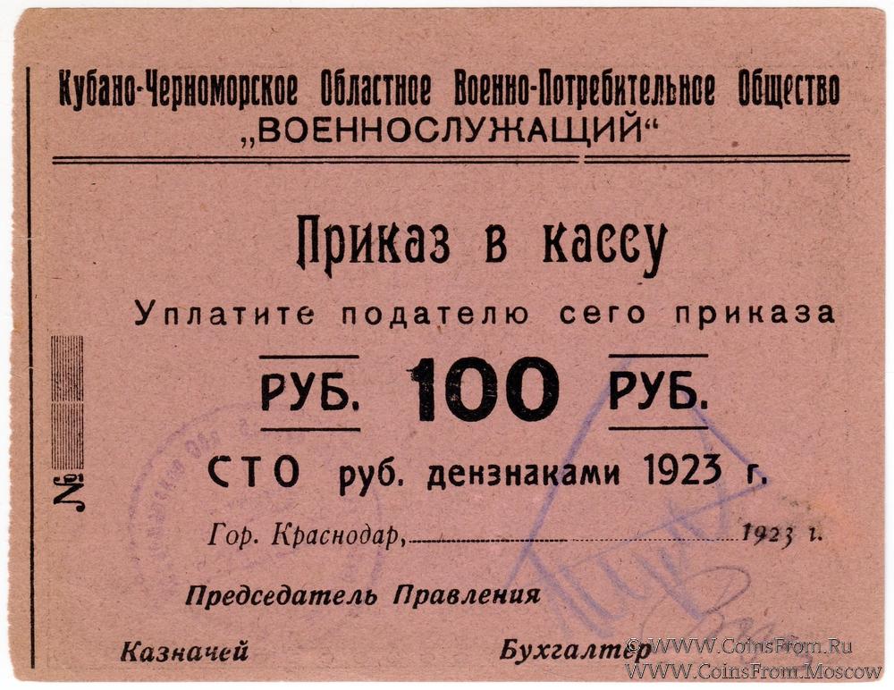 Приказ в кассу 1923 г. Без номера. Кубано-Черноморское Областное Военно-Потребительское Общество "ВОЕННОСЛУЖАЩИЙ".