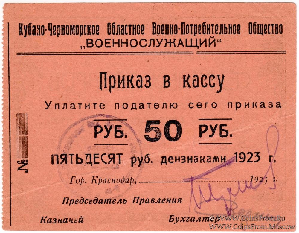 Приказ в кассу 1923 г. Без номера. Кубано-Черноморское Областное Военно-Потребительское Общество "ВОЕННОСЛУЖАЩИЙ".
