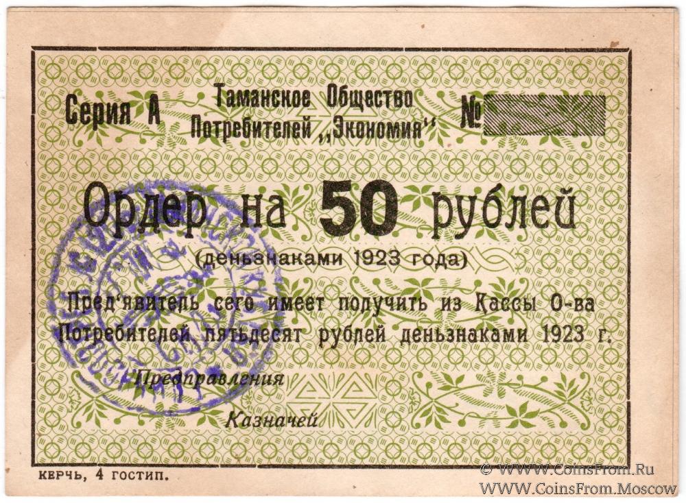 Ордер (дензнаками 1923 г.). С сиреневой печатью, без номера, без подписей. Вторичное использование. Таманское Общество Потребителей "Экономия".