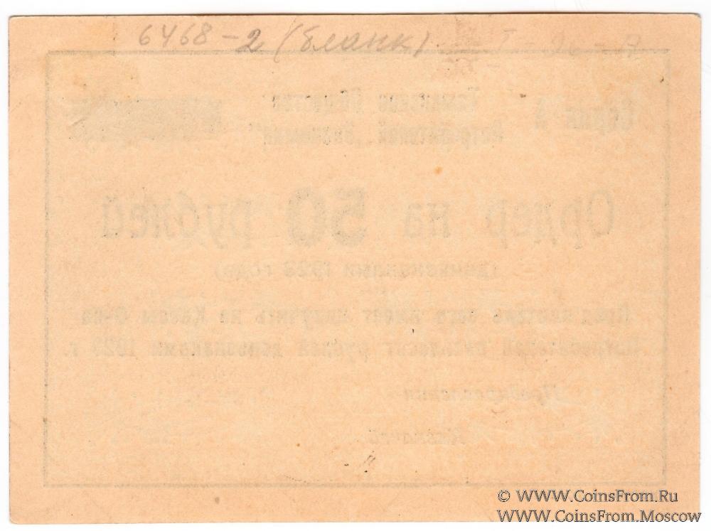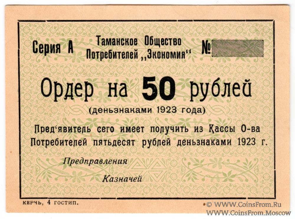 Ордер (дензнаками 1923 г.). Бланк. Таманское Общество Потребителей "Экономия".