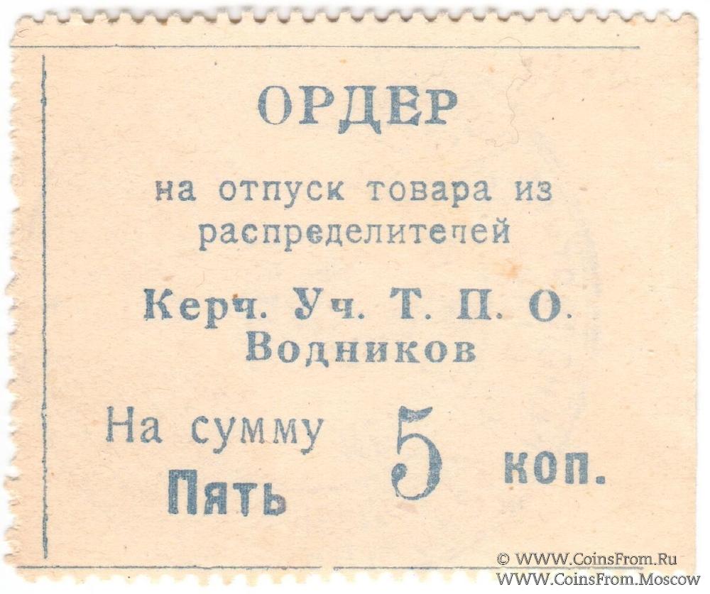 Ордер без даты с печатью Общества на реверсе. Рамка и зубцовка с 3-х сторон. Керч. Уч. Т.П.О. Водников.