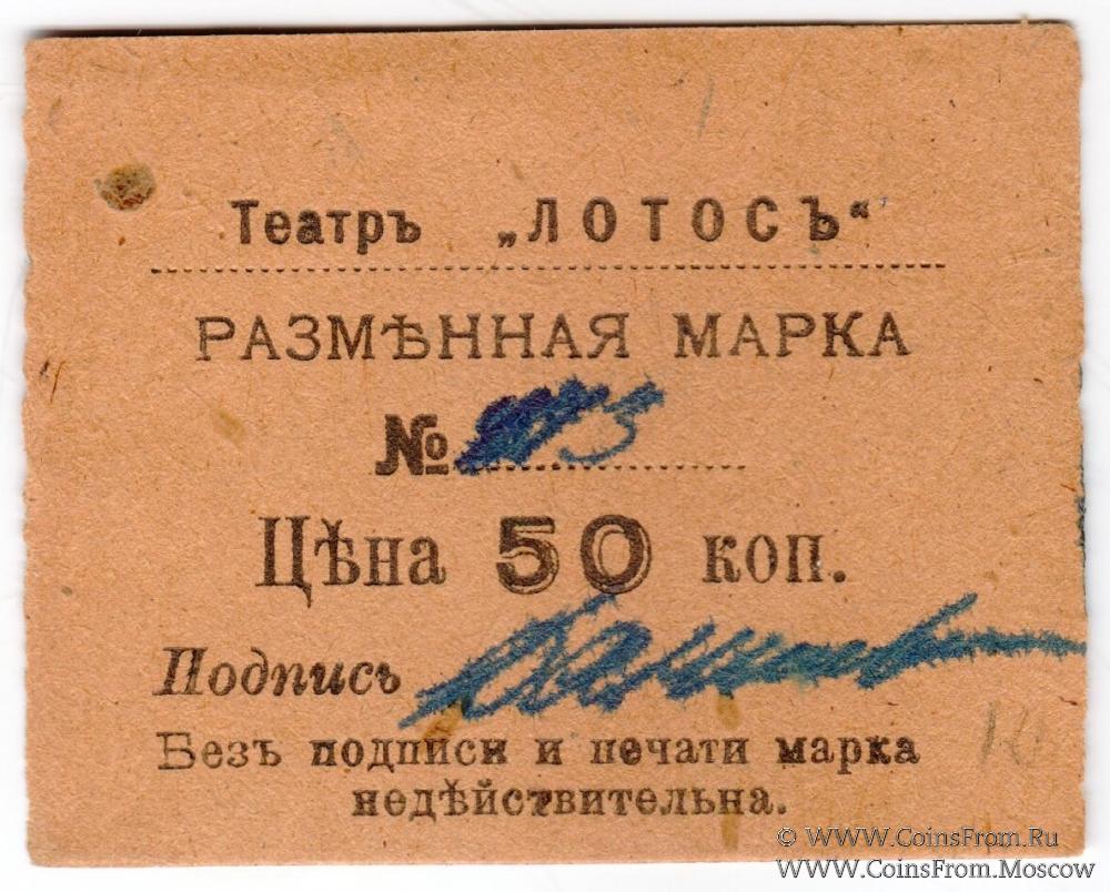 Разменная марка. Бумага коричневая плотная. Штамп овальный на реверсе с датой 21 августа 1918 г. Театр "ЛОТОС".
