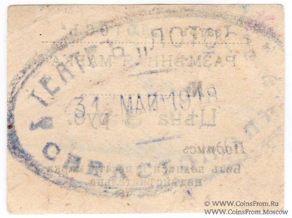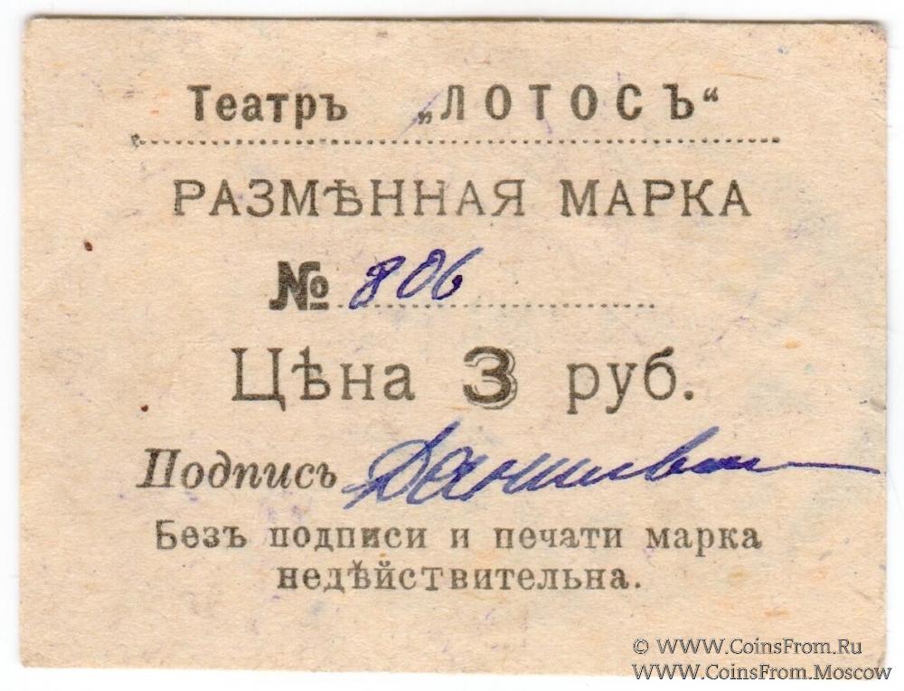 Разменная марка. Бумага белая тонкая. Штамп овальный на реверсе с датой 31 мая 1918 г. Театр "ЛОТОС".