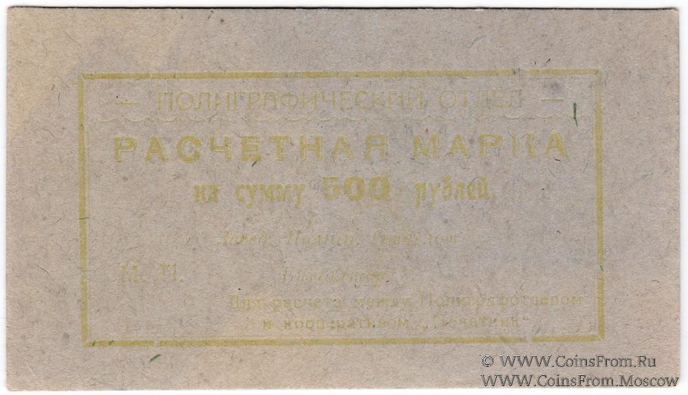 Расчетная марка без даты (1923 г.). Бланк. Рамка и текст зелёно-жёлтые. Полиграфический отдел. Кооператив "Печатник".