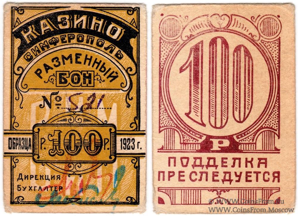 Разменный бон 1923 г. Фон цветной. Толстая бумага. На реверсе "Р" без точки. Казино (ВИМ) г. Симферополь.