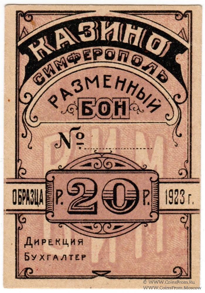 Разменный бон 1923 г. Бланк. Фон цветной. Толстая бумага. На реверсе "Р" с точкой. Казино (ВИМ) г. Симферополь.