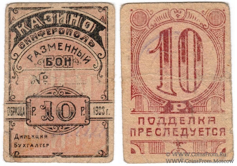Разменный бон 1923 г. Печать на реверсе. Фон цветной. Толстая бумага. На реверсе "Р" с точкой. Казино (ВИМ) г. Симферополь.