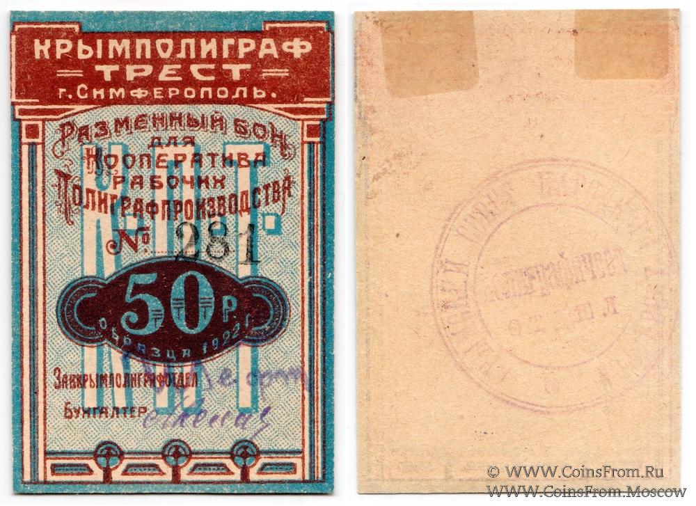 Разменный бон. Малая печать на реверсе. Синий фон, рамка и шрифт коричневые. Крымполиграфтрест.
