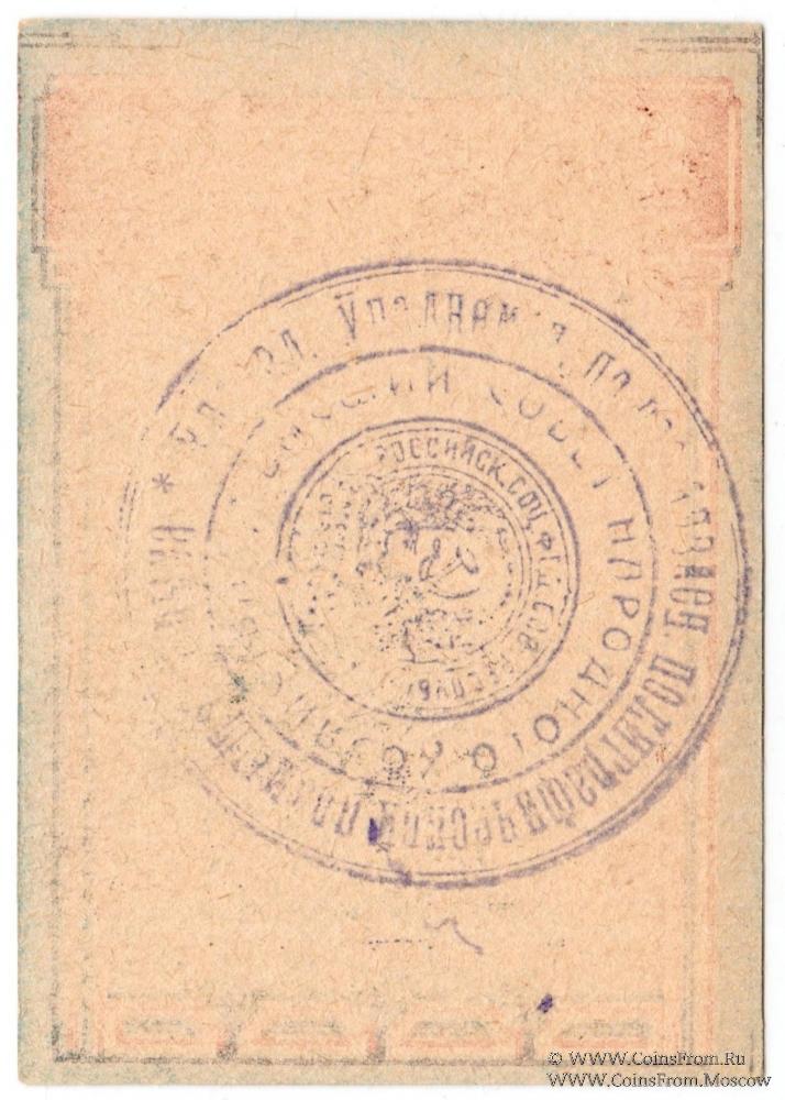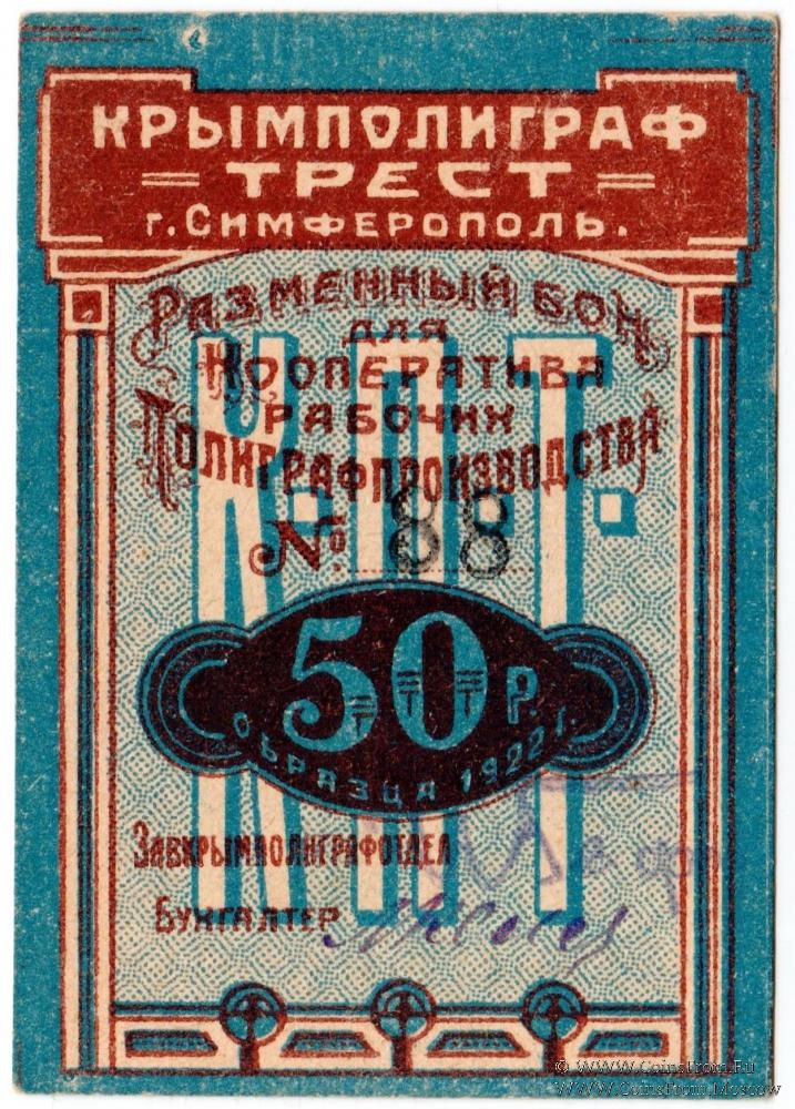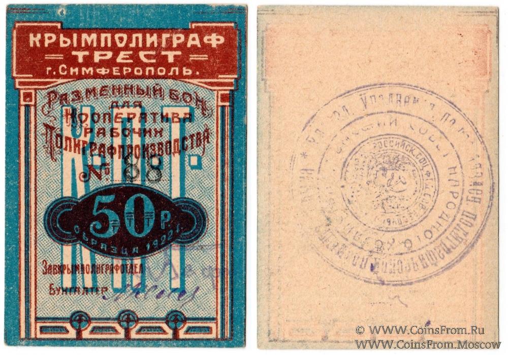 Разменный бон. Большая гербовая печать на реверсе. Синий фон, рамка и шрифт коричневые. Крымполиграфтрест.