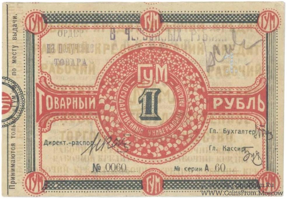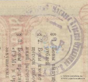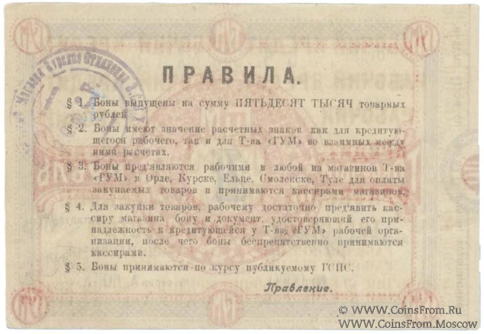 Бона (без права передачи) без даты (1921 г.). В товарных рублях. ГУМ (Орел) Курское отделение. Принимаются только ГУМом по месту выдачи. ГУМ - Государственный универсальный магазин.