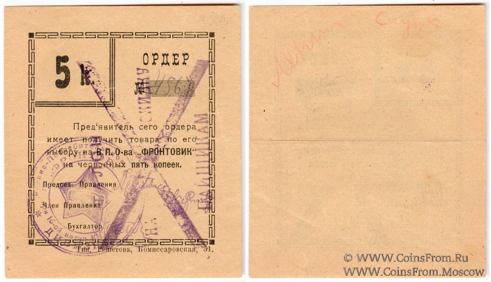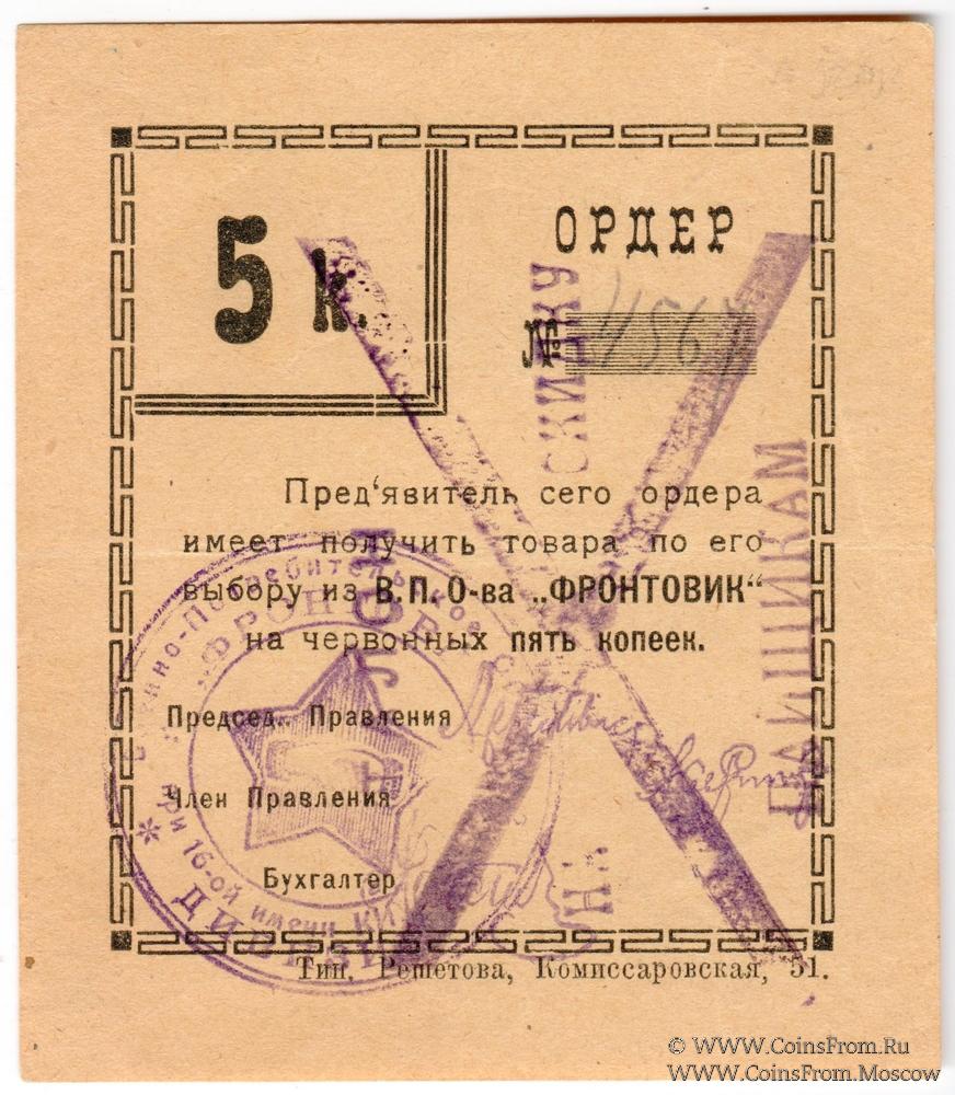 Ордер в червонных копейках без даты (1923 г.). Военно-потребительское общество "Фронтовик" при 16-й стрелковой дивизии им. Киквидзе.