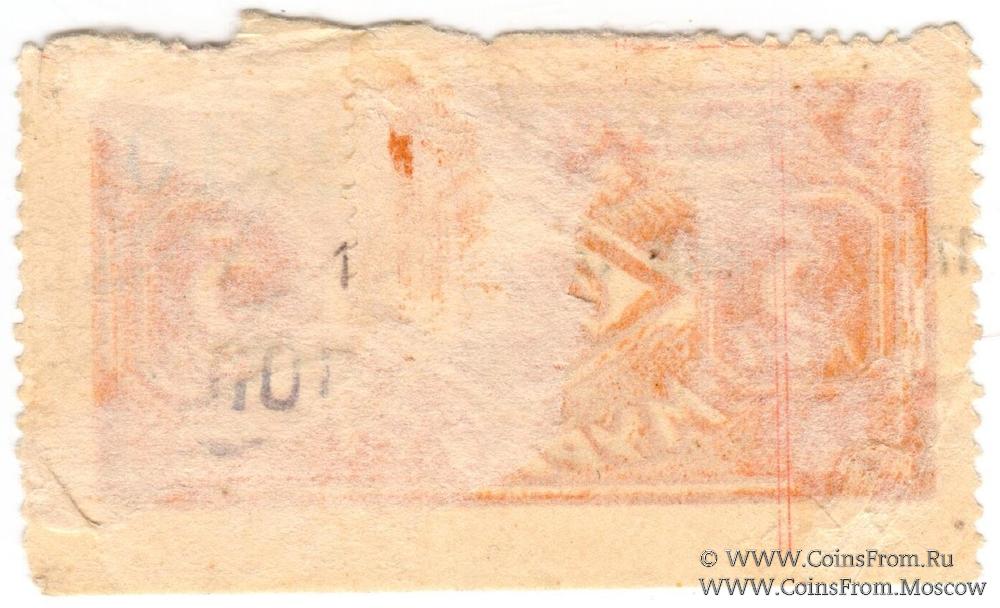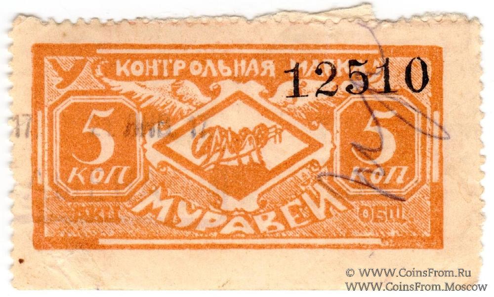 Контрольная марка без даты (1917 г.). Зубцовка с 3-х сторон. На аверсе штамп "ПОГАШЕНА" с датой (25.01.1917) и подписью факсимиле. Акционерное общество "МУРАВЕЙ".