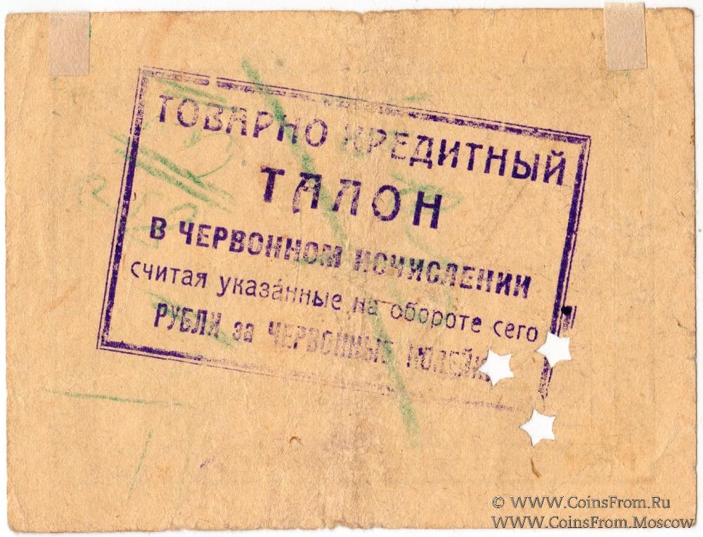 На реверсе: Штамп "Товарный кредитный талон в червонном исчислении, считая указанные на обороте сего РУБЛИ за ЧЕРВОННЫЕ КОПЕЙКИ".