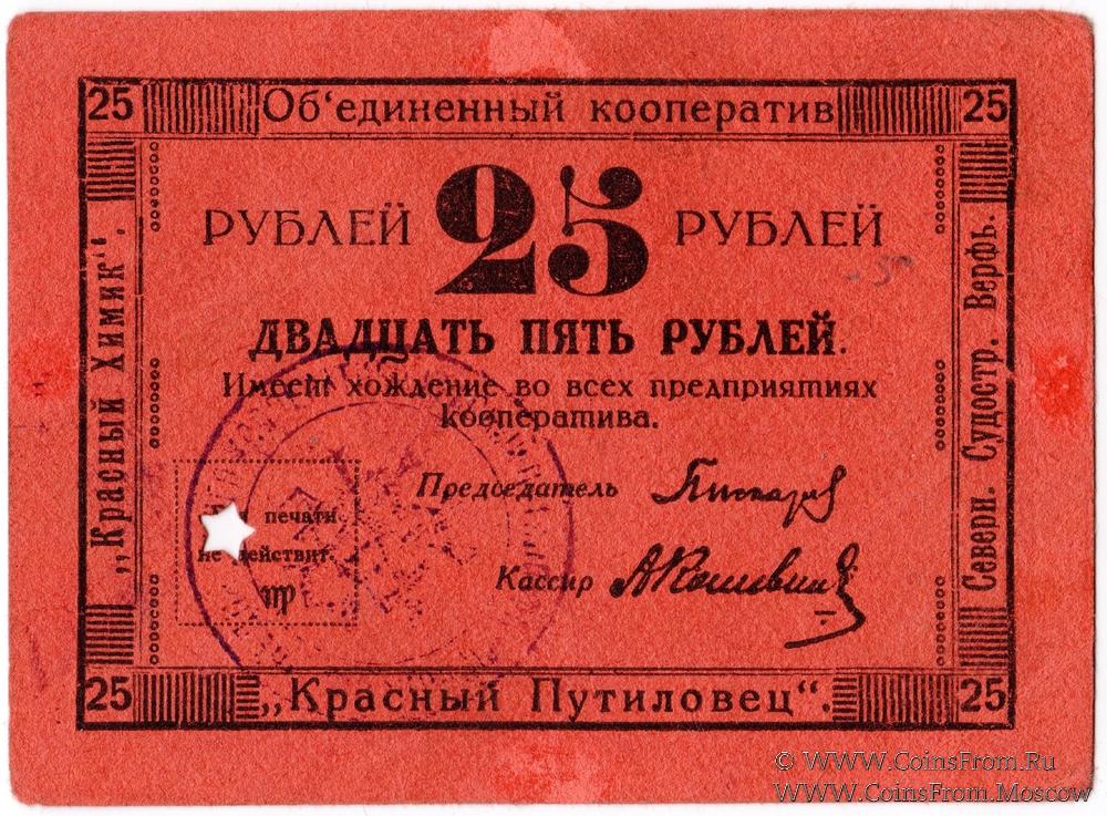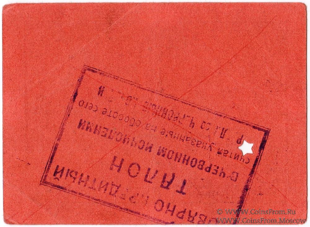 Товарный кредитный талон в червонном исчислении. Бумага плотная. Просечка - 1 звездочка. Печать на аверсе. Штамп на реверсе перевернут. Объединенный кооператив "Красный Химик", "Красный Путиловец", "Северная Судостроительная Верфь".