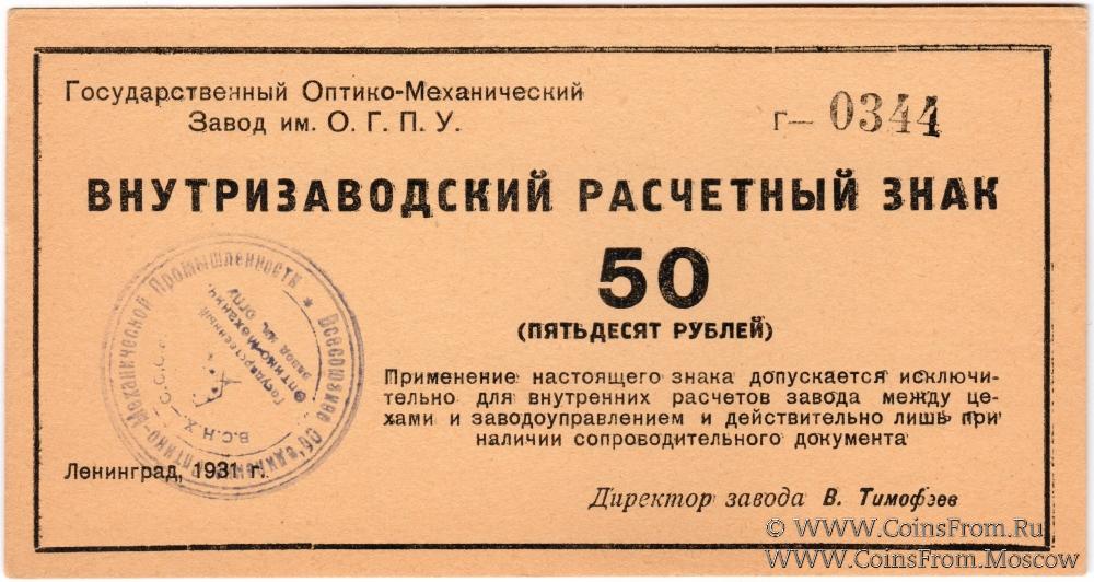 Внутризаводской расчетный знак 1931 г. С печатью. Государственный оптико-механический завод им. ОГПУ.