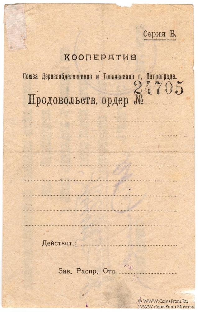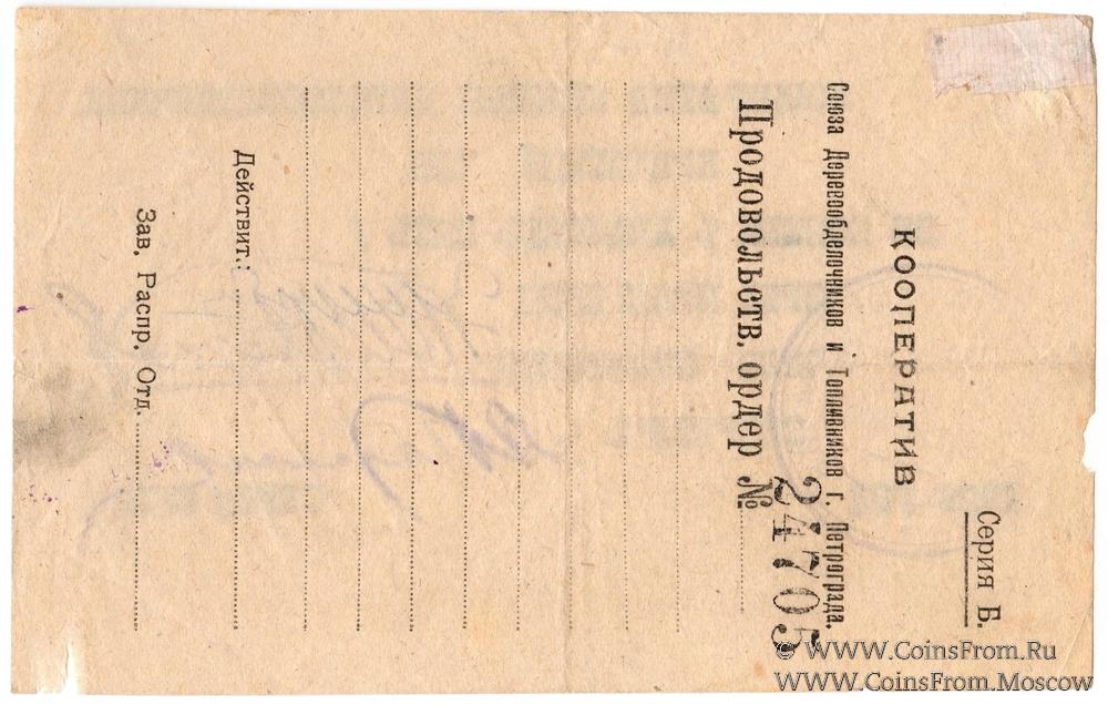 Вторичное использование: на реверсе Продовольственный Ордер Кооператива Союза Деревообделочников и Топливников г. Петрограда.