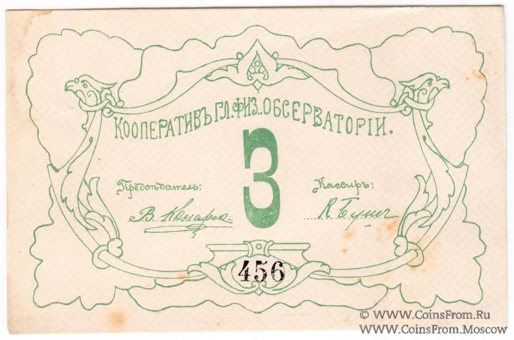 Главная > Магазин > Моя коллекция > Банкноты России периода Первой Мировой Войны, Гражданской войны, революции и первых лет Советской власти > Частные боны Гражданской войны > Ленинградская область > Санкт-Петербург (Петроград / Ленинград) > Кооператив обсерватории > 3 рубля б/д (Петроград)