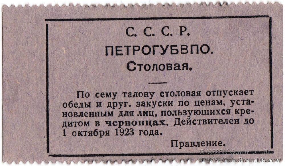 Талон (в червонцах, действителен до 1 октября 1923 г.). ОБРАЗЕЦ: надпись от руки по диагонали слова "Образец". Фиолетовый. С печатью. Столовая. ПЕТРОГУБВПО (Петроградское Губернское Военно-Потребительское Общество).