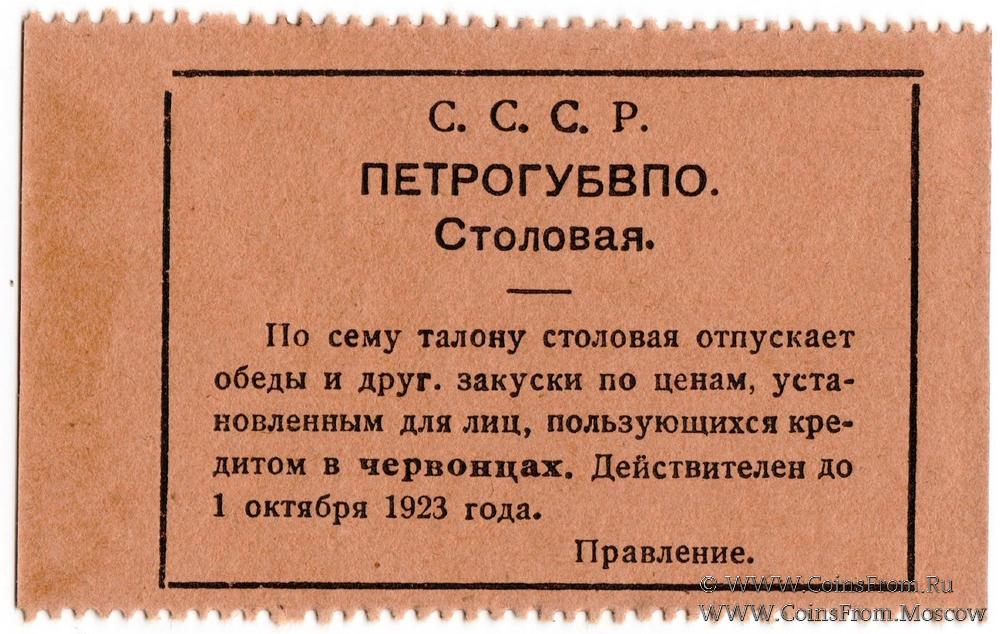 Талон (в червонцах, действителен до 1 октября 1923 г.). Бланк. Коричневый. Столовая. ПЕТРОГУБВПО (Петроградское Губернское Военно-Потребительское Общество).