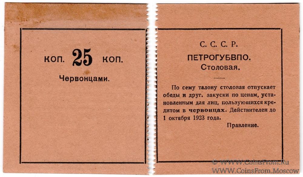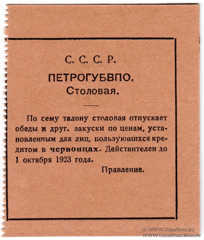 Талон (в червонцах, действителен до 1 октября 1923 г.). Бланк. Коричневый. Столовая. ПЕТРОГУБВПО (Петроградское Губернское Военно-Потребительское Общество).