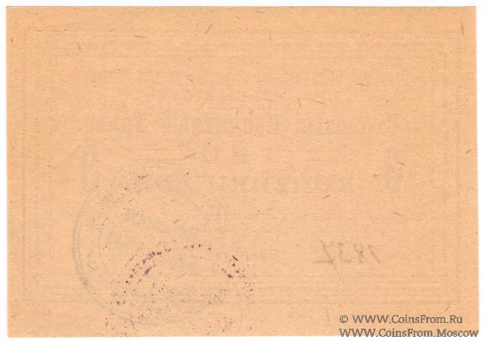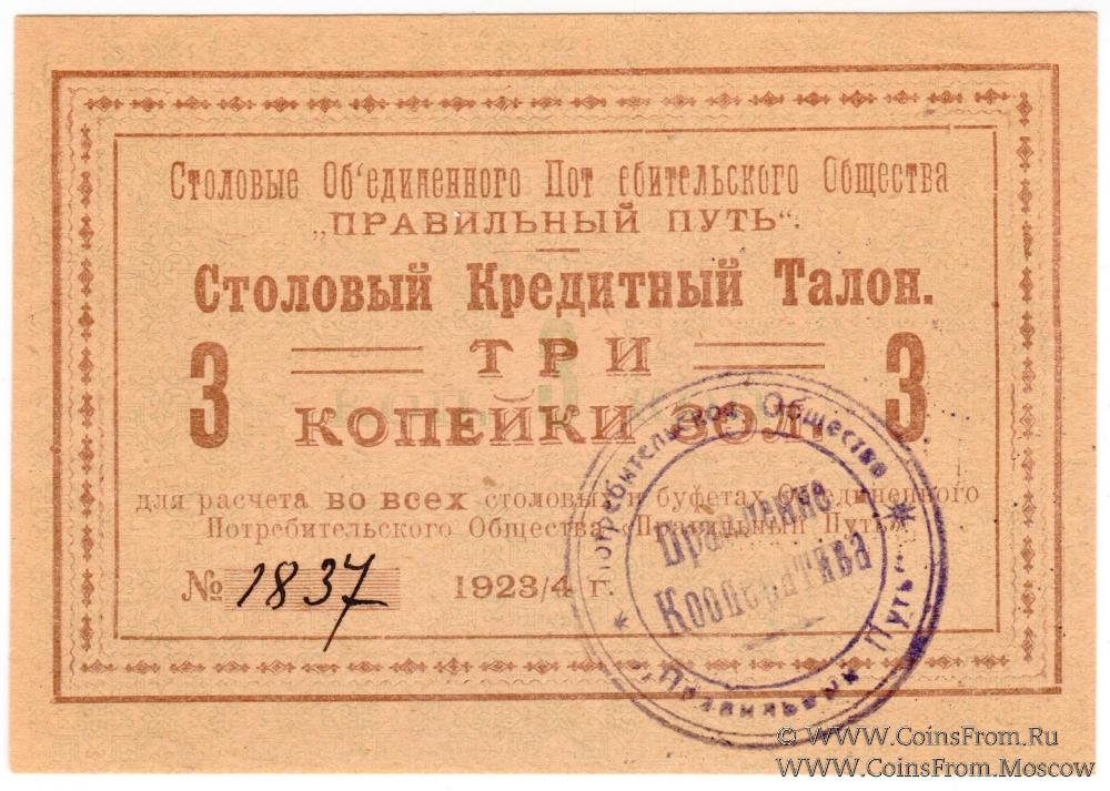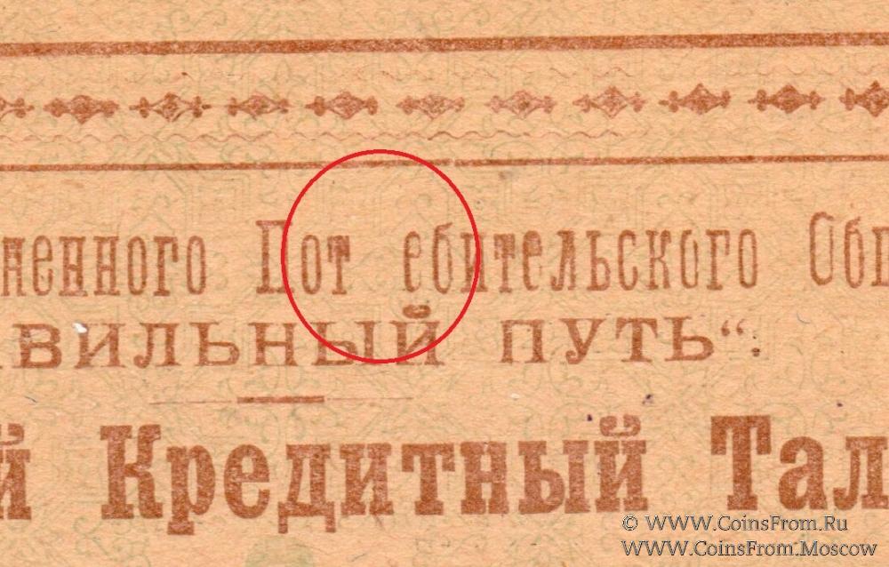 Столовый кредитный талон (золотом). БРАК: непропечатана буква "Р" в слове "Пот__ебительского".Шрифт коричневый. На аверсе печать Правления Кооператива. Объединенное Потребительское Общество "Правильный путь".
