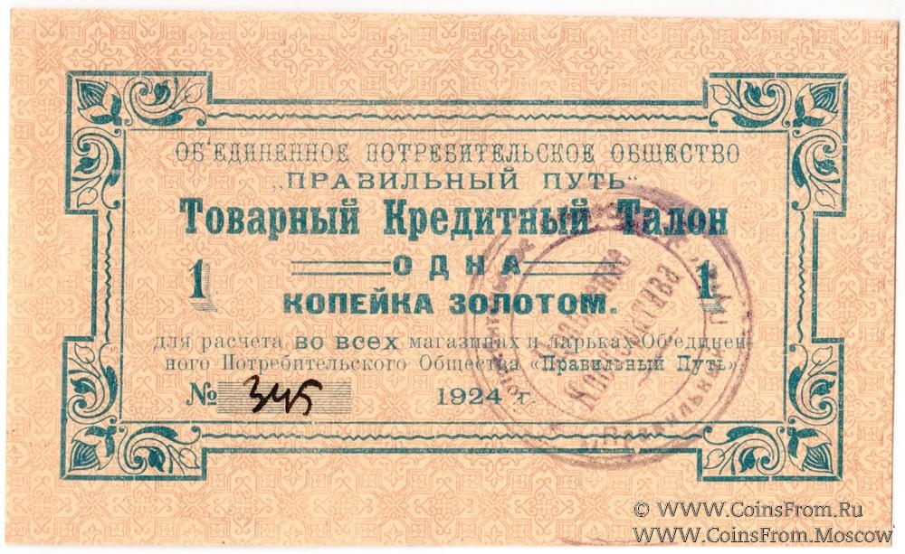 Товарный кредитный талон (золотом). Без подписи. Объединенное потребительское общество "Правильный путь".