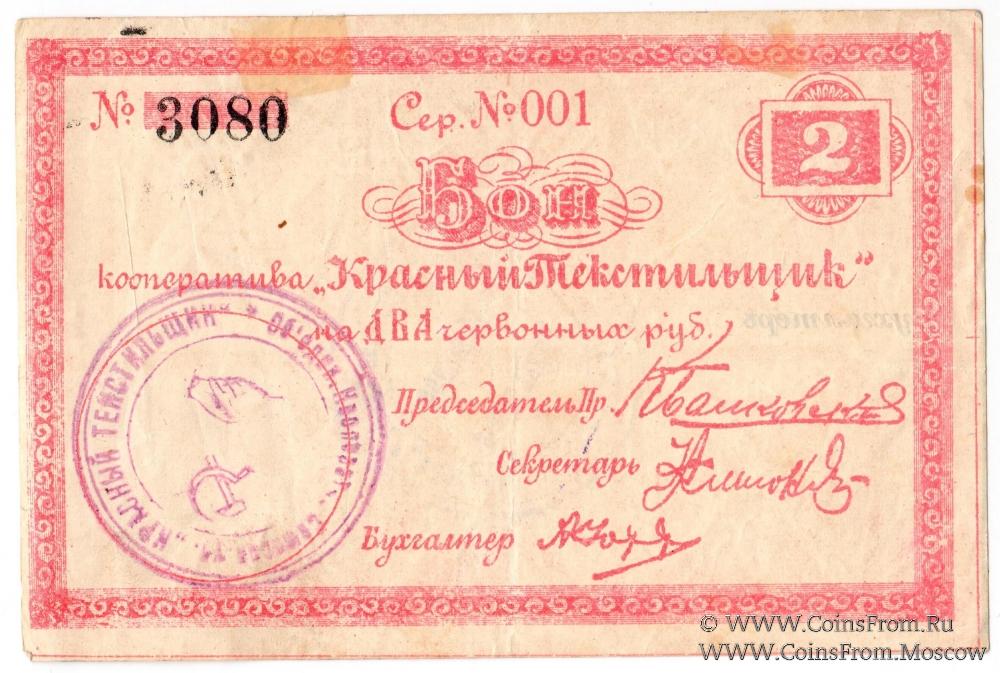 Печать на аверсе Кооператива "Красный текстильщик". Печать на реверсе Фабрики "Работница". Вторичное использование (на реверсе надпечатка "Бухгалтеръ").