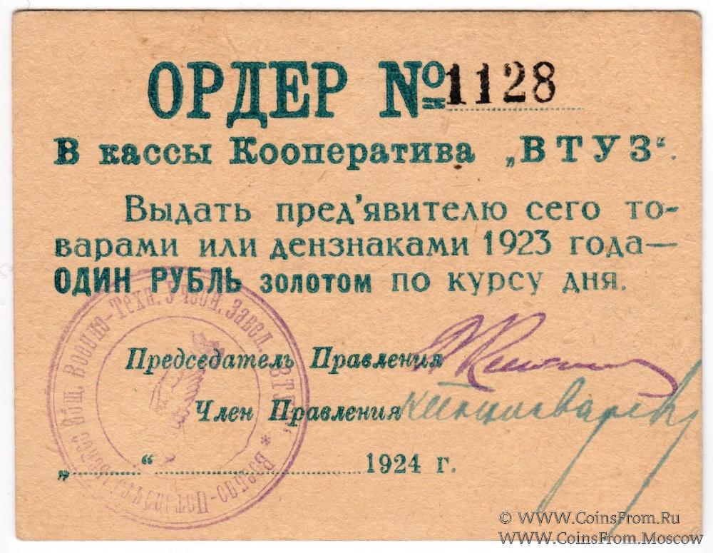 Ордер в рублях золотом 1924 г. Буква "В" в слове "ВТУЗ" замкнута.