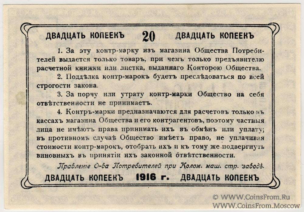 Контрольная марка 1916 г. Водяной знак - "горизонтальные волны". Общество потребителей при Коломенском машиностроительном заводе (ОПКМЗ).