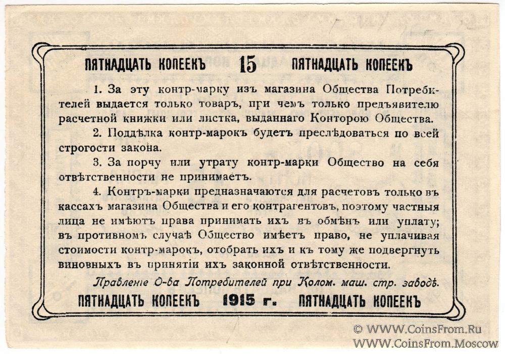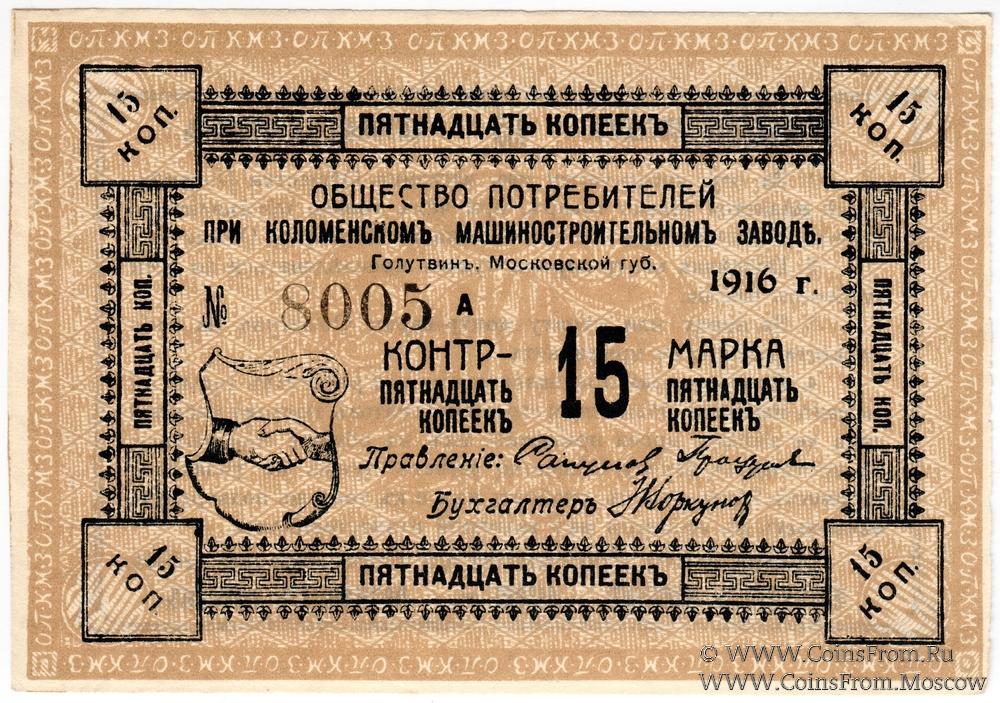 Контрольная марка 1916 г. Водяной знак - "горизонтальные волны". Общество потребителей при Коломенском машиностроительном заводе (ОПКМЗ).